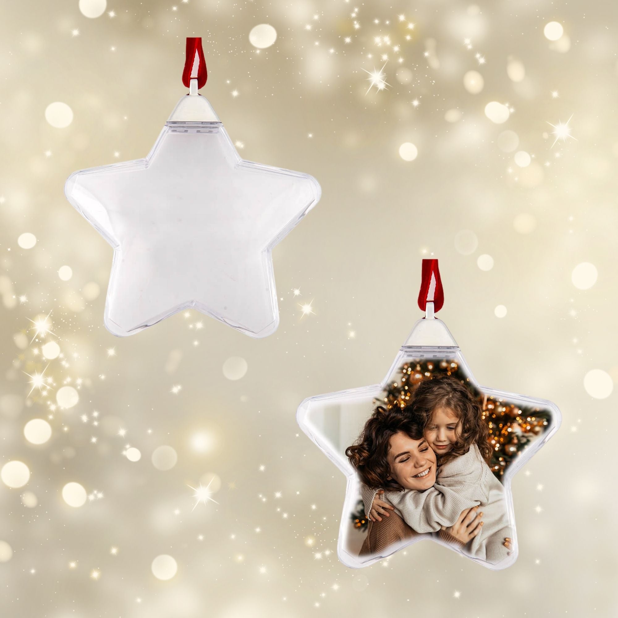Chcesz dodać na choinkę coś naprawdę osobistego, ale jednocześnie uniwersalnego? Bombka w kształcie gwiazdki na zdjęcie to piękny sposób, by wyeksponować ukochane wspomnienia w świątecznej oprawie. Przezroczysta gwiazdka z elegancką czerwoną zawieszką świetnie prezentuje się na choince, w oknie czy jako element świątecznej dekoracji na półce.