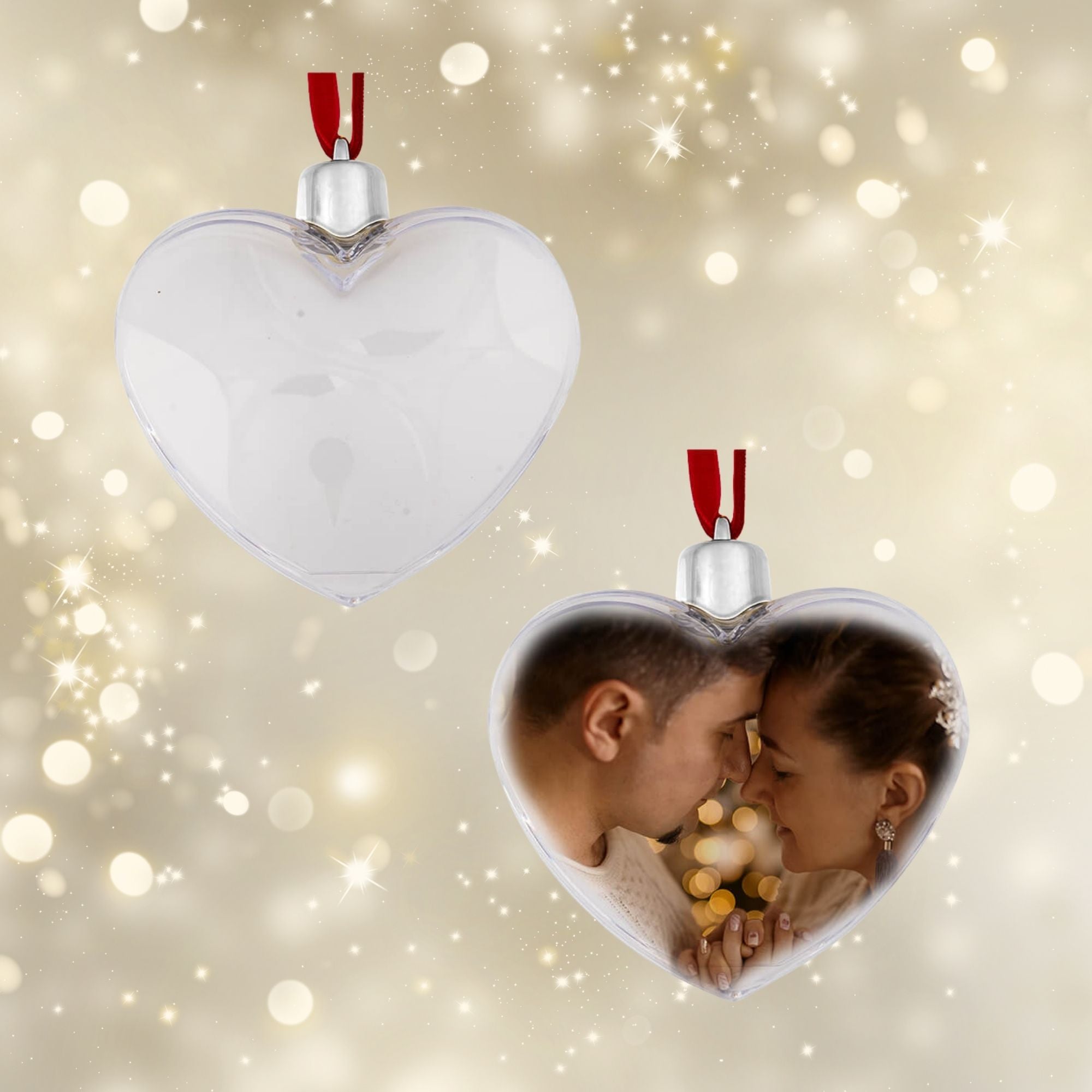 Chcesz, aby na Twojej choince pojawił się prawdziwy symbol miłości? Bombka w kształcie serca na zdjęcie to idealny sposób, by wyeksponować ulubioną fotografię – z partnerem, dzieckiem, rodziną lub pupilem – w ciepłej, świątecznej oprawie. Przezroczyste serce z elegancką srebrną „czapeczką” i czerwoną zawieszką pięknie prezentuje się na tle lampek choinkowych.