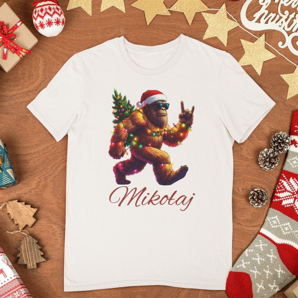 Szukasz świątecznego prezentu z charakterem? Personalizowana koszulka z imieniem i rockowym Yeti/Bigfootem to idealna propozycja dla kogoś, kto kocha święta, ale w wersji mniej grzecznej i dużo bardziej imprezowej. Brodaty stwór w czapce Mikołaja, okularach przeciwsłonecznych, opleciony kolorowymi lampkami i z choinką na plecach pokazuje znak rock’n’rolla – trudno o bardziej wyrazisty świąteczny motyw!