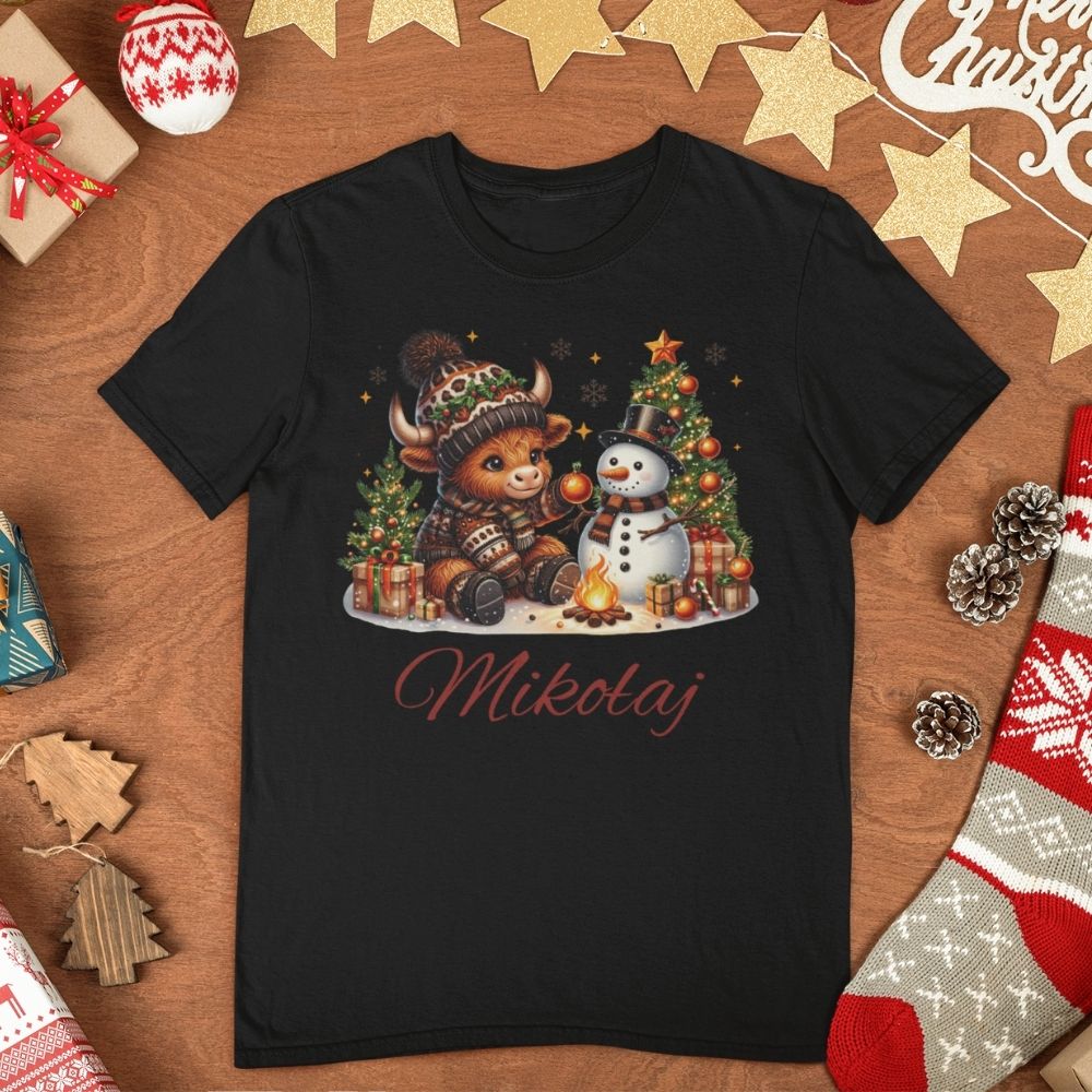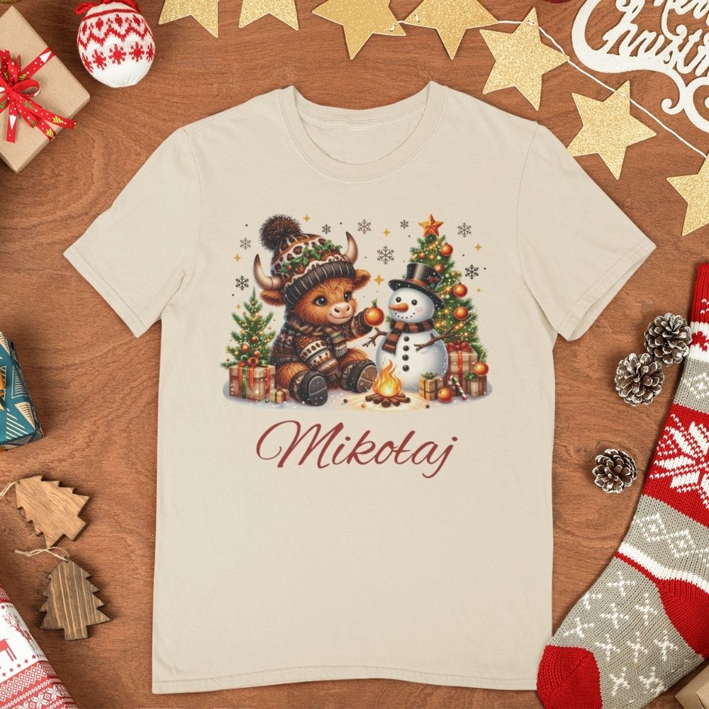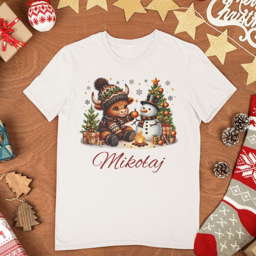 Personalizowana Świąteczna Koszulka – Imię + Uroczy Byczek i Bałwanek