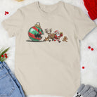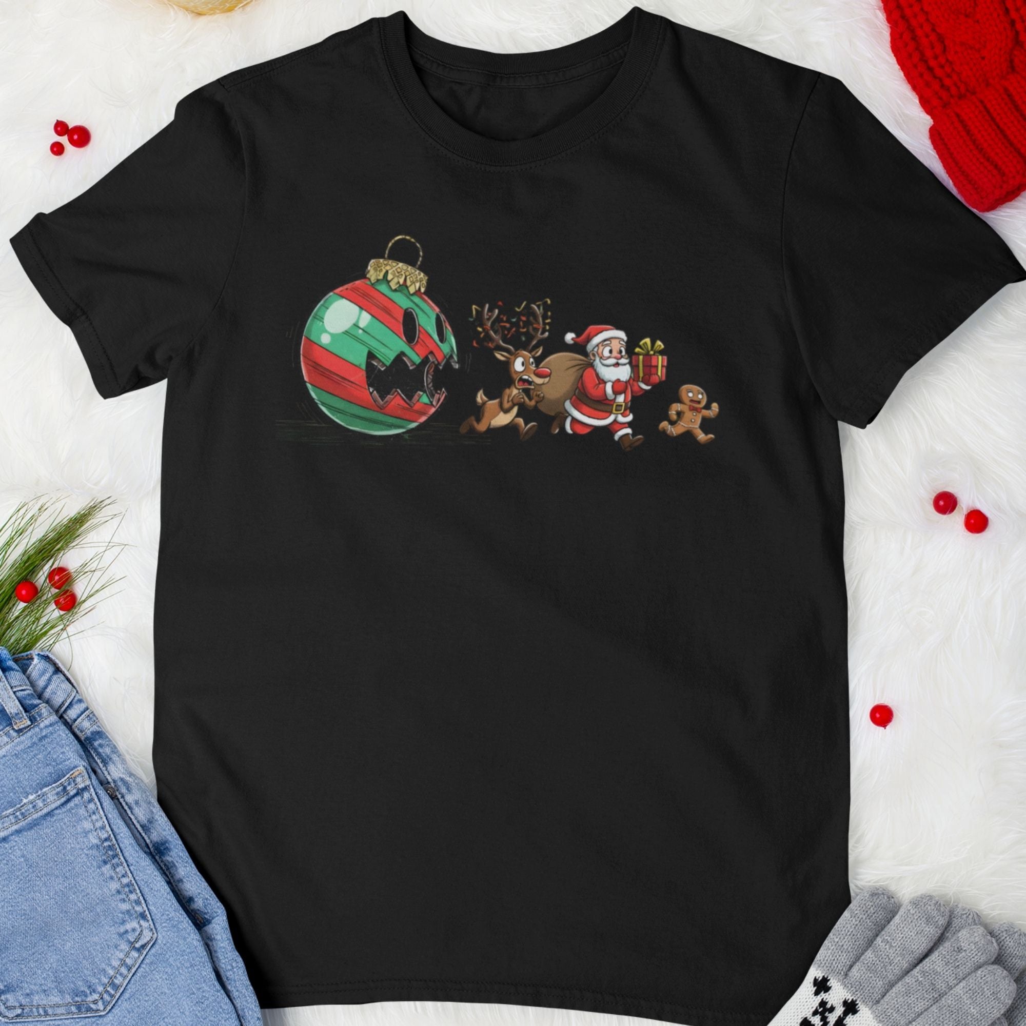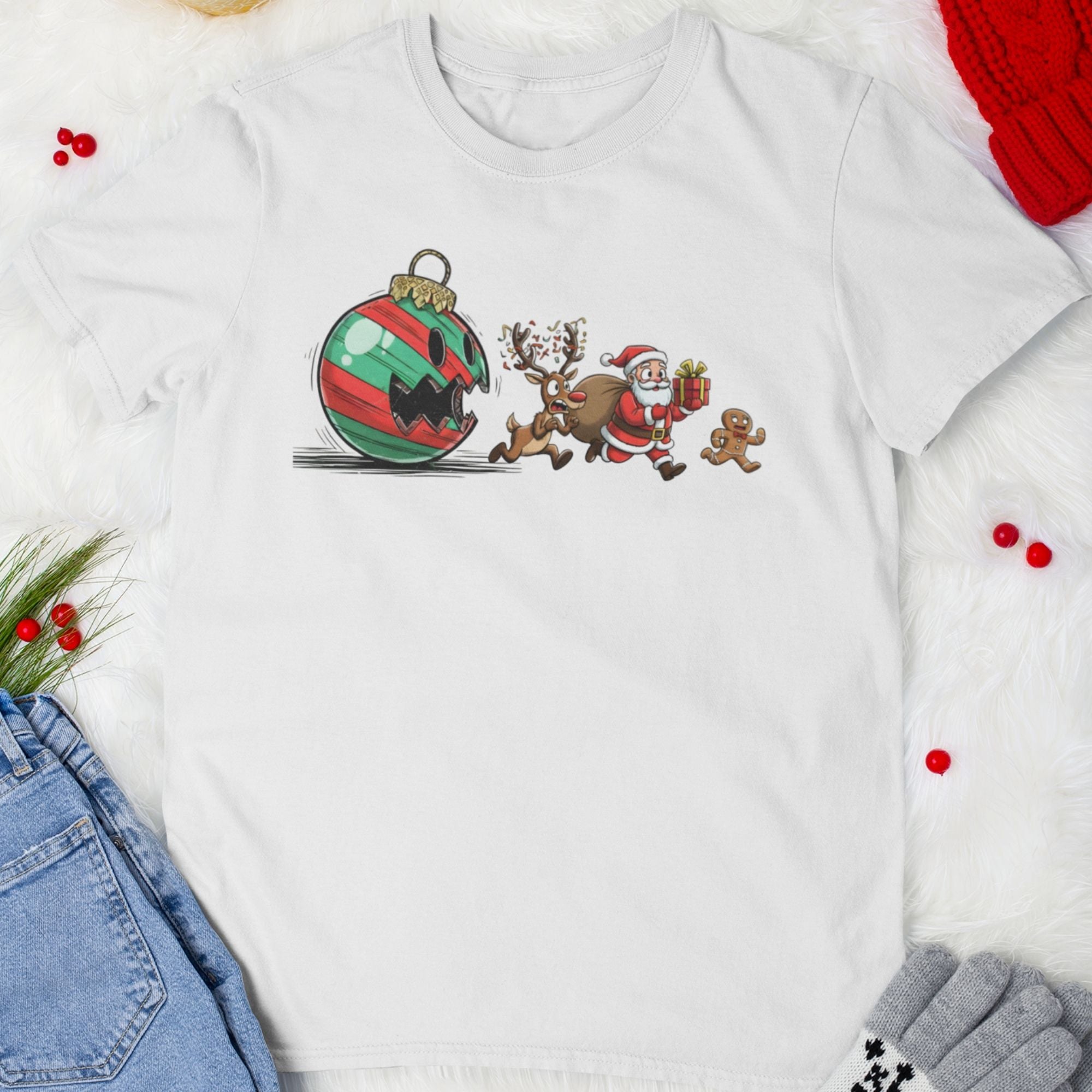 Święta świętami, ale czasem robi się… niebezpiecznie zabawnie! Świąteczna koszulka „Uciekający Mikołaj” przedstawia Mikołaja, renifera i piernikowego ludzika, którzy w panice uciekają przed ogromną, „pożerającą” bombką choinkową. To idealny wzór dla osób, które kochają świąteczny klimat, ale z dużą dawką humoru i odrobiną szaleństwa.